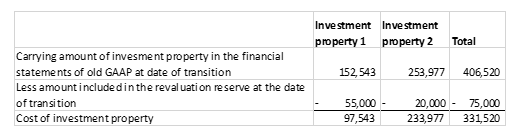 There are two investment properties at the date of transition and no additional properties were acquired since transition. The total cost of the land included within investment property is CU50,000 split CU25,000 to investment property 1 and CU25,000 to investment property 2. Assume the 2 properties were purchased at the same time on 1 January 2011. Assume that investment property 2 was disposed of on 30 June 2016 and at that date the carrying amount was CU253,977 which equated to the sales price at that date.