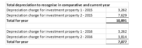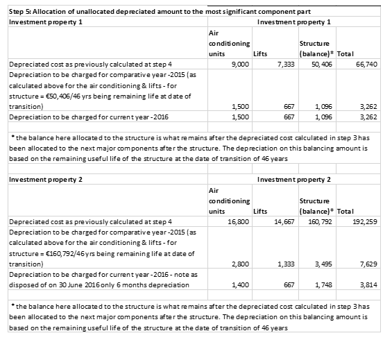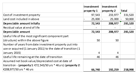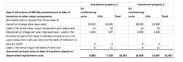 As stated above Section 28.10 allows companies an exemption an exemption from Section 12.15 to determine the depreciated cost of each of the major components of an investment property at the date of transition to FRS 105. This has been illustrated in the example below.