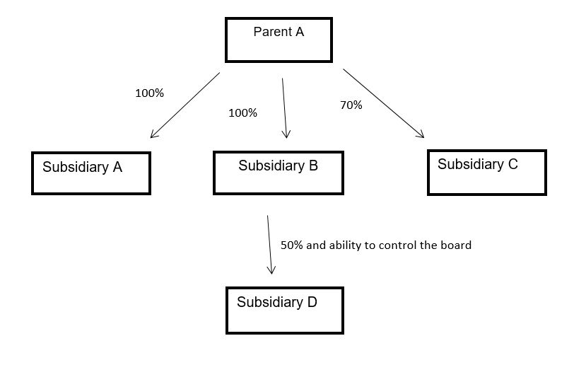A group exists where a company owns greater than 50% of the ordinary shares or where there is a right to control the board of directors (i.e. a golden share arrangement exists). Any transactions entered into by any of the below companies are related party transactions. However as stated above, Section 33.1A of FRS102 allows an exemption from disclosure where the companies are wholly owned subsidiaries. Therefore in this case, no disclosure is required for transactions entered into between Parent A, Subsidiary A and Subsidiary B in each of these financial statements. Disclosure of transactions entered into between any of the aforementioned entities with Subsidiary C & D will need to be disclosed. In the financial statements of Subsidiary C & D, all transactions entered into with the other group companies and each other will need to be disclosed.