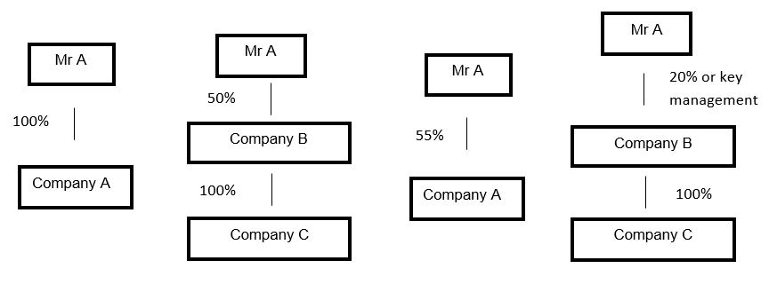 In the illustration below, Company A, B and C are related parties. If Mr A owned 100% of Company B, they would also be related parties.